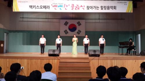 맥키스社(회장 조웅래. 옛 (주)선양)가 본교에서 찾아가는 힐링음악회를 열었다. 16일 창의적 체험활동시간을 이용해 한 시간여 동안 진행된 이날 공연은 학생들의 뜨거운 호응 속에 성황리에 끝났다.
