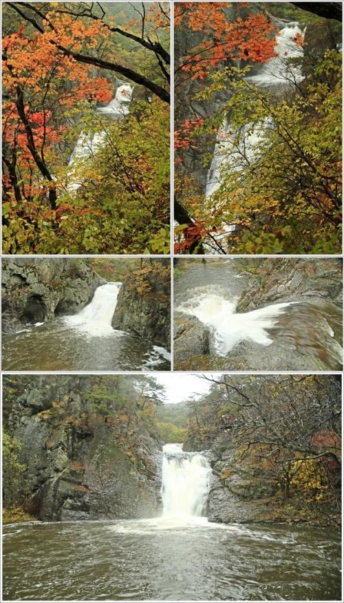 용추폭포 위쪽으로 올라가면 좁은 개울에 단풍이 절정이다. 800여m 지점의 갈림길에서 오른쪽으로 200m 거리에 아담하게 두 줄기로 이루어진 절구폭포, 왼쪽으로 400m 거리에 2단의 물줄기가 웅장하고 거대한 용연폭포가 있다. 비가 내리는 날이라 폭포의 물줄기에서 생동감이 느껴진다.
