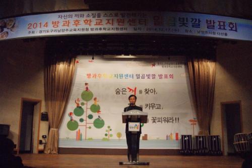 바로 어제 우리 교육지원청 주관 학생들 발표회가 있었다. 행사명이 ‘자신의 끼와 소질을 스스로 발견해 가는 2014 방과후학교지원센터 일곱빛깔 발표회’이다. 남양주시청 다산홀에서 열렸는데 무려 4백 여명이 관람하였다. 미술전시와 예능발표를 겸한 자리다.