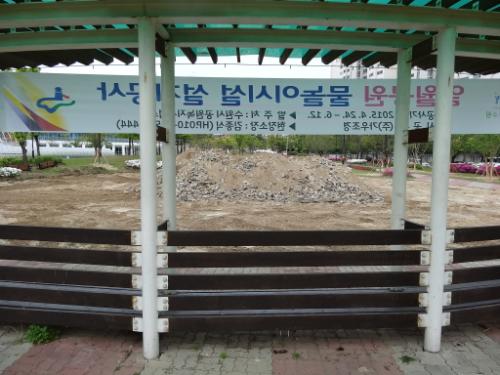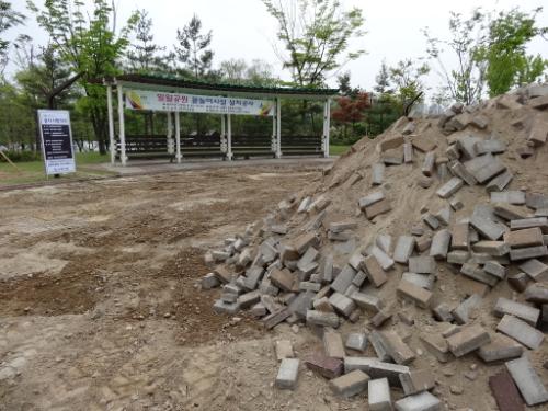 기자의 습성은 버릴 수 없다. 카메라를 들고 현장을 들러보았다. 공사 시행 안내판이 세워져 있다. 공사명은 일월공원 물놀이 시설 설치 공사, 공사 위치는 권선구 구운동 56-1. 공사 개요는 물놀이 조합놀이대 1조와 투수블럭 포장외 1조 등이다. 공사기간은 4월 25일부터 6월 10일까지다.