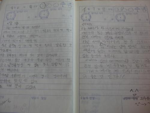 바로 어제의 일이다. 식탁 위에 일기장 몇 권이 놓여 있다. 겉표지를 보니 지금 대학 4학년인 딸의 초등학교 때 일기장이다. 일기장 뿐 아니라 유치원과 초등학교 때 독서록, 유치원과 초등학교 저학년 때의 그림일기 등 10여권이 놓여 있다. 무슨 일일까?