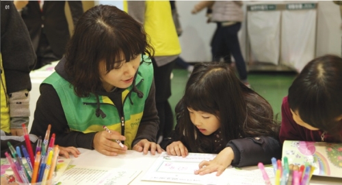 01 초록우산어린이재단이 마련한 ‘함께 키우는 인성나무’ 체험 중인 한 아이가 우리 집 가훈을 만들고 있다.