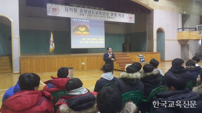 본격적인 특강에 앞서 서령고 한승택 교장은 수시 및 정시준비에 여념이 없는 고3 학생들을 격려하고 추운 날씨에도 불구하고 강의에 참석한 학부모들에게 감사의 인사를 전했다. 이어 충남교육 발전과 미래 인재 양성에 불철주야 헌신하고 있는 김지철 교육감에 대한 감사와 존경을 표했다.