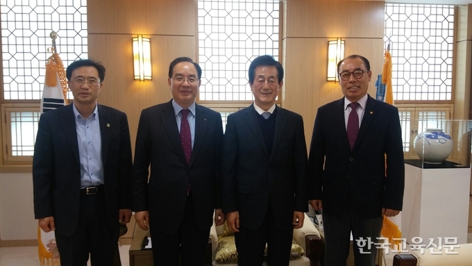 하윤수(왼쪽 두번째) 한국교총 회장과 이태석(오른쪽) 경북교총 회장, 안해천(왼쪽) 경북교총 수석부회장은 12일 이영우(오른쪽 두번째) 경북교육감과 교육현안 간담회를 갖고 교권 보호, 교원 복지, 교육내실화를 위해 상호 협력하기로 했다.