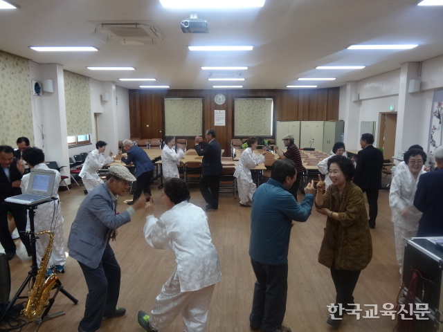 그뿐 아니다. 회의 전, 분위기 차원에서 색소폰 연주가 있었다. 후반에는 권선동 중앙공원 선무팀의 나라사랑 기공시범이 있었다. 악단의 음악 반주에 맞춰 회원과 선무(善武)팀이 함께 어울리는 ‘내 나이가 어때서’ ‘밀양 아리랑’ 등 여흥 시간도 있었다. 지난달에 이어 포크댄스 시간도 가졌다. 회원들은 동심의 셰계로 돌아가 즐거운 시간을 보냈다.
