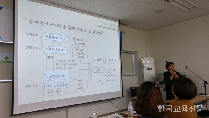 워크샵에서는 마을학교 운영 사례로 설상숙(지역교육네트워크 화월주 사무국장)강사의 '여기, 마을교육공동체를 향해가는 과정에서'를 통하여 참가자들은 마을학교 운영에 대한 이해를 하는 시간을 가진 후, 마을학교 운영 지침 설명, 그리고 분과별 토론회가 있었다.