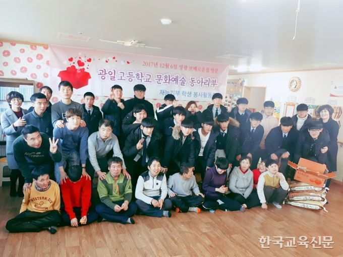 광주 광일고(교장 김성률) 재능 봉사활동단은 6일 영광 ‘보배로운 집’에서 오후 1시부터 약 2시간여 동안 사물놀이와 노래공연 및 쌀을 포함한 식료품을 기부하는 활동을 벌였다.