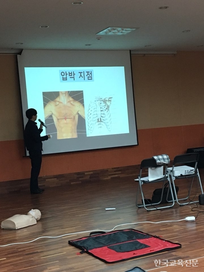 5월 1일(화) 오후 1시. 강릉문성고등학교(교장 김종덕)는 중간고사 기간을 활용하여 소강당에서 심폐소생술 연수를 실시하였다. 이날 연수는 교사의 바쁜 일정을 고려하여 체육부가 전문 강사를 직접 학교로 초빙하여 이뤄졌다. 이론(2시간)과 실습(2시간)으로 진행된 연수에 전 교직원이 참여해 높은 관심을 나타냈다.