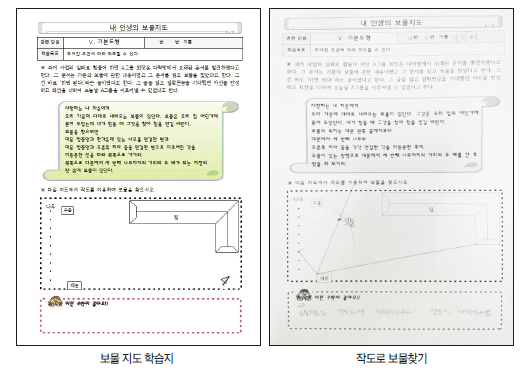 학생들이 수학수업에 흥미를 갖고 참여할 수 있도록 만화나 영화의 소재로 자주 등장하는 보물찾기로 학습지를 제작·지도했다. 조상님이 남기신 보물편지를 읽고, 작도로 보물의 위치를 찾으며, 더 나아가 학생들이 나만의 보물지도를 직접 제작하고, 친구의 보물지도에서 작도를 통해 보물을 찾는 활동이다. 학생들은 보물지도라는 단어에 흥분했고 조상님의 보물이 무엇인지 궁금해했다. 또한 보물지도를 직접 만들어 본다는 것에 굉장한 호기심을 보였다.