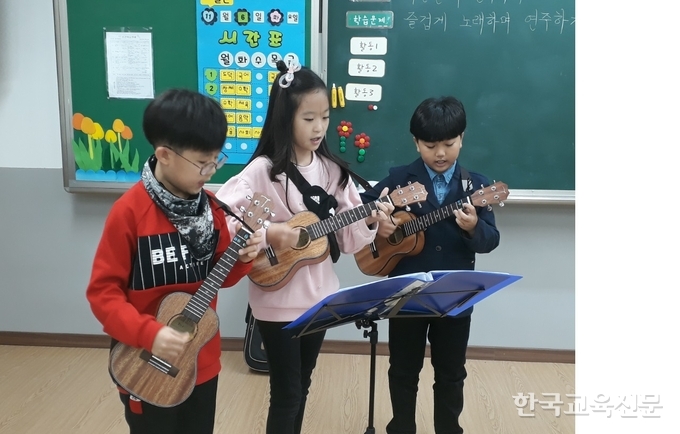 요즘 수원 곡정초등학교(교장 김석진) 3학년 교실에서는 즐겁게 노래를 부르며 악기를 연주하는 소리가 울려 퍼지고 있다. 이렇게 즐거운 학교 문화가 시작된 것은 올해 9월, 3학년 학생들을 대상으로 우쿨렐레라는 새로운 악기를 활용한 1인 1악기 교육을 실시하면서 부터이다.