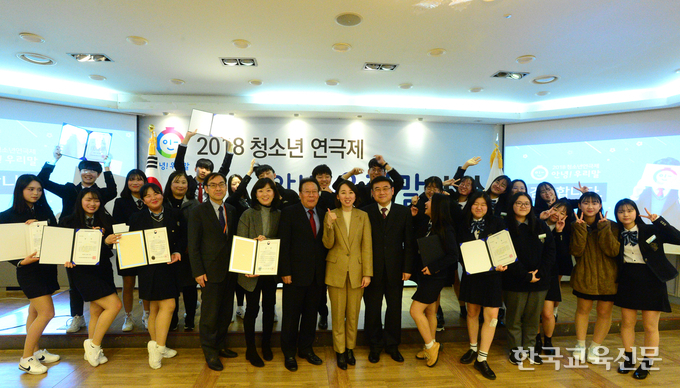 ‘2018 청소년연극제 안녕! 우리말’ 시상식이 12일 한국교총회관에서 열렸다. 올해 으뜸상(최우수)의 영예를 안은 부산정보고 ‘영우’는 2016년에 이어 두 번째 우승팀으로 자리매김했다. 이들은 소설 ‘어린왕자’를 각색한 창작극으로 눈길을 끌었다. 극중 ‘어린왕자’가 자신이 거주하는 별의 장미를 살리기 위해 지구에서의 학생 언어습관 개선에 일조하는 내용을 선보였다.