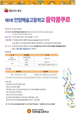 참가 부문은 피아노·관악·현악·타악·성악이다. 중등부 성악을 제외한 나머지 전공은 자유곡을 선정해 참가하면 된다. 대회 일정과 경연 시간은 8월 19일 5시 30분 안양예고 홈페이지에 탑재된다.
