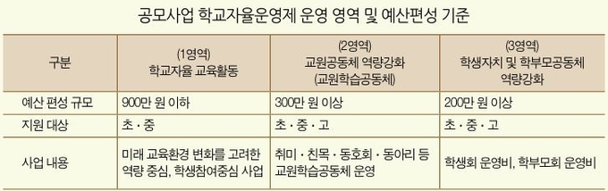학교자율 교육활동 영역은 학교의 여건과 미래 교육환경의 변화를 고려한 역량중심, 학생참여중심 교육활동을 전개할 수 있는 사업을 말한다. 교원공동체 역량강화 영역은 학생과 교사의 성장을 위한 교사들의 자발적·협력적·지속적인 교원학습공동체 운영을 말한다. 학생 및 학부모공동체 역량강화 영역은 학생자치 활성화를 위한 학생회 운영비, 학부모 학교 교육 참여 활성화를 위한 학부모회 운영비 등을 말한다.