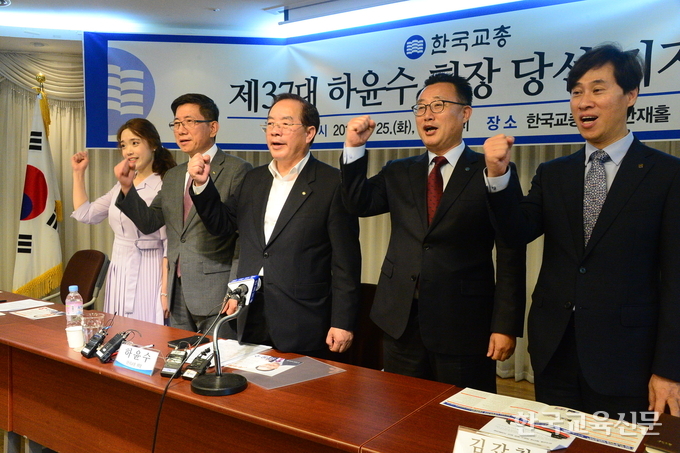 [한국교육신문 정은수 기자] 재선에 성공한 하윤수 제37대 한국교총 회장이 25일 한국교총회관에서 가진 기자회견에는 수십 명의 기자가 취임 일성을 듣기 위해 모였다.