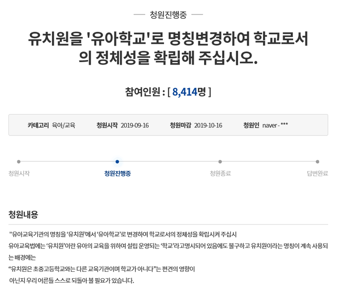청원자는 이어 “1995년 일제 강점기 잔재 유물이라고 해서 ‘국민학교’를 ‘초등학교’로 바꾼 사례가 대표적”이라고 지적하면서 “그럼에도 불구하고 똑같은 일재 잔재인 ‘유치원’ 명칭을 현재까지 유지하는 것은 혹 초등학교와 달리 유치원이 의무교육이 아니거나 초등학교보다 덜 중요해서 그런 것인지, 정부와 국회의 무관심 때문인지 의문이 든다”고 말했다.
