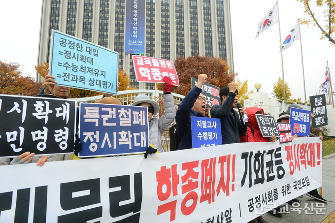 공정사회를 위한 국민모임(대표 이종배)은 13일 오전 정부서울청사 정문 앞에서 공정한 대입제도를 위한 학부모단체 시국선언을 하며 '정시확대 시국선언 기자회견'을 했다.