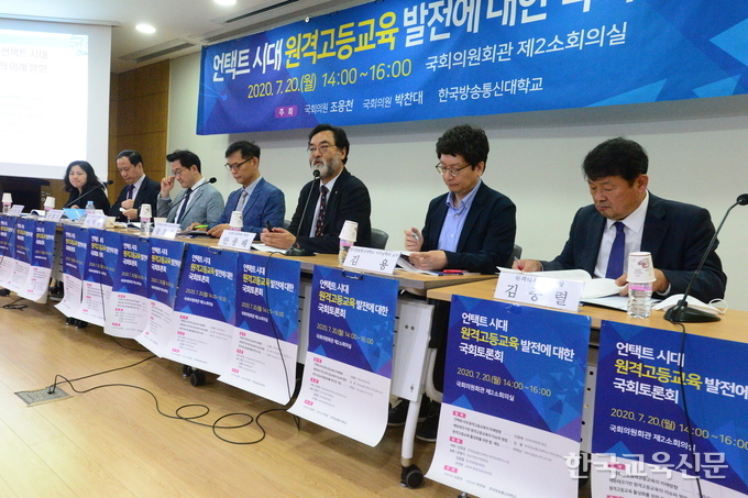 20일 오후 국회의원회관 제2소회의실에서 한국방송통신대, 조응천‧박찬대 의원실 주최로 열린 국회토론회에서 인종배 국제 미래학회장(오른쪽 세번째)이 '포스트 코로나 언택트 시대 원격 고등교육의 미래 방향'이란 주제로 발제하고 있다.