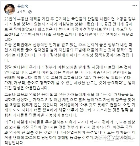 이날 윤 의원은 “요즘 온라인에서 선풍적인 인기를 얻고 있는 주부 논객의 글은 ‘정부가 내 집 마련 사다리를 끊어 임차인을 늘려 자신들의 표밭에 머물게 하는 것이 정책의 진의이고 그러니 정책 실패가 아니라 정책 성공’이라는 내용”이라며 “이런 의심은 부동산뿐 아니라 계층 사다리 전반에서도 팽배해 있다”고 게재했다.