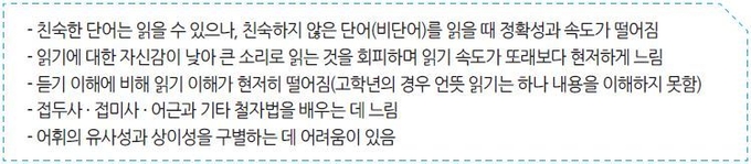 난독증(Dyslexia)은 특정 학습장애의 한 유형인 읽기 장애로, 문자 해독(decoding) 및 이해(comprehension), 철자(spelling)에 어려움을 보이는 것이 특징이다. 학생의 인지능력이나 학습 제공과는 무관하게 말소리의 가장 작은 단위인 ‘음소’를 조작하는 음운인식능력의 결함으로 인해 해독에 어려움을 겪기 때문에 누군가에게는 당연한 ‘읽기’가 이들에게는 당연하지 않다. 한글에 관심이 없어서가 아니라, 어려우니까 관심 갖기 싫을 수 있다. 집중력이 낮아서가 아니라, 교과서의 어떤 지점을 살펴봐야 하는지 찾지 못한 것일 수 있다. 친구들을 방해하고 싶은 게 아니라, 교사가 자신에게 더 개입해주기를 바라는 신호를 보내는 것일 수도 있다.