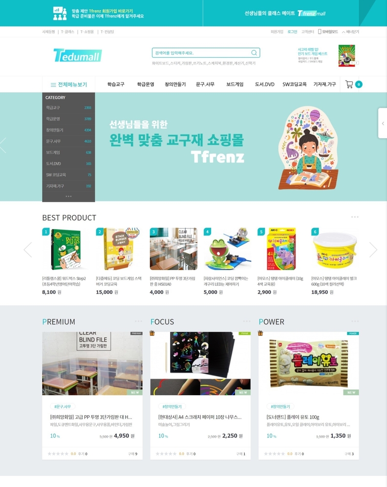 티에듀몰은 학교 현장에 최적화한 교구재 쇼핑몰이다. 수업, 학급 운영, 방과후학교 등에 필요한 교구재부터 문구, 사무용품, 보드게임, 기자재까지 한 번에 구매할 수 있다. 모든 상품을 상황별로 나누고 한눈에 볼 수 있게 구성한 점도 눈길을 끈다. ‘학습교구’ 카테고리에선 과목별로 활용할 수 있는 상품을 묶어서 소개한다. ‘학급운영’ 카테고리에는 ▲원격수업 ▲학생선물 ▲수업도구 ▲환경미화 ▲행사용품 등으로 분류했다. 키워드로 필요한 상품을 검색할 수도 있다.
