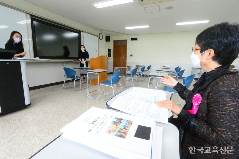 박하나(왼쪽 첫번째) 이평초등학교 교사와 염지유(두번째) 만승초등학교 교사가 24일 경인교대 경기캠퍼스에서 개최된 제65회 전국현장교육연구발표대회 생활지도분과에서 심사위원의 질의에 답변하고 있다.
