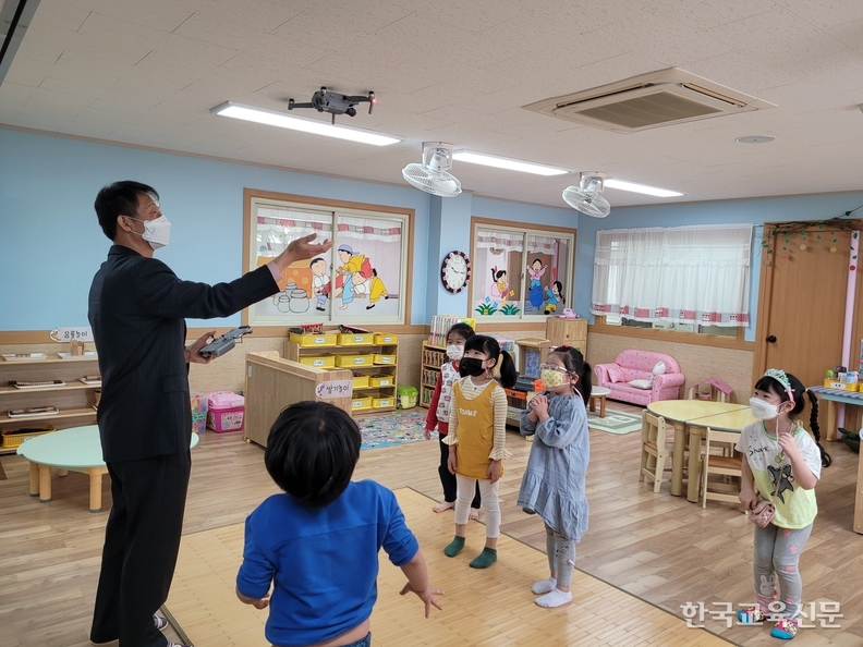 드론 체험 수업을 마친 햇살반 유아는 “드론이 날아갈 때 시원한 바람이 불어와서 좋았고, 드론이 우리 사진을 멋지게 찍어주어서 재미있었어요.”라고 소감을 말했다.