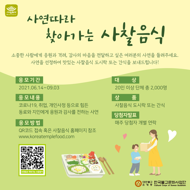 한국불교문화사업단(단장 원경스님)은 ‘사연 따라 찾아가는 사찰음식’ 수기를 온라인으로 모집한다. 공모 주제는 ‘소중한 사람에게 응원과 격려, 감사의 마음을 전달하고 싶은 여러분의 사연’이다. 사연이 채택되면 사찰음식 도시락 또는 간식을 증정한다.