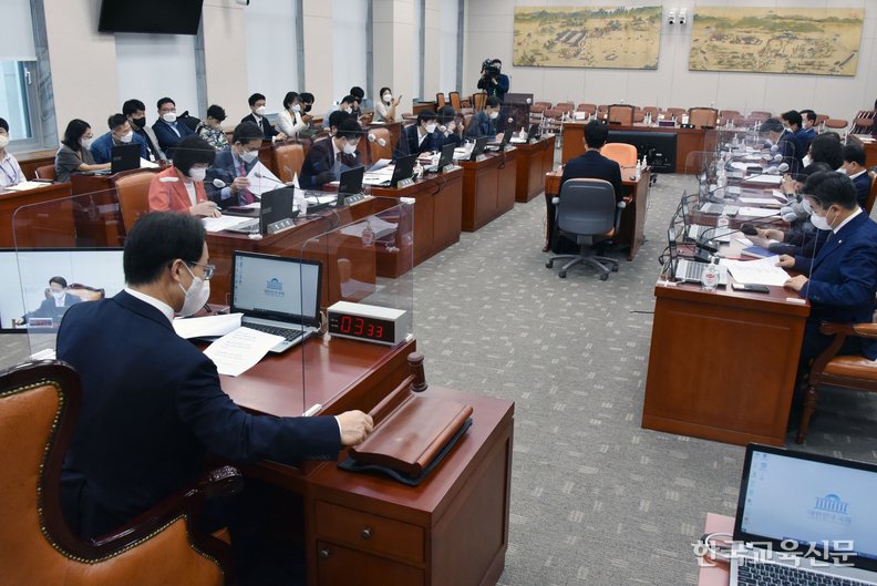 조해진(국민의힘) 신임 국회 교육위원회 위원장이 14일 서울 여의도 국회에서 열린 교육위원회 전체회의에서 의사봉을 두드리고 있다.