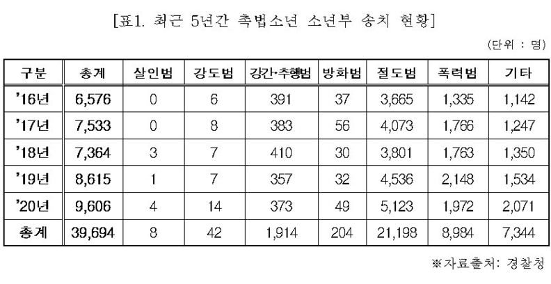 김용판 국민의힘 의원이 5일 경찰청으로부터 제출받은 ‘최근 5년간 촉법소년 소년부 송치현황’에 따르면 2016년 6576명, 2017년 7533명, 2018년 7364명, 2019년 8615명, 2020년 9606명으로 5년간 총 3만9694명의 촉법소년이 범죄를 저지른 것으로 나타났다.
