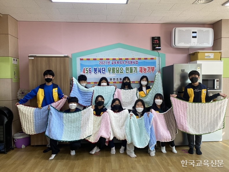 경북 영천초등학교(교장 여은숙)는 교육복지우선지원사업의 하나로 456 봉사단을 운영하고 있다. 4~6학년 11명으로 구성된 봉사단은 다가오는 겨울 외로움과 추위로 어려움을 겪으실 지역 어르신들에게 무릎담요를 만들어 기부하는 재능기부 봉사활동을 실시했다.