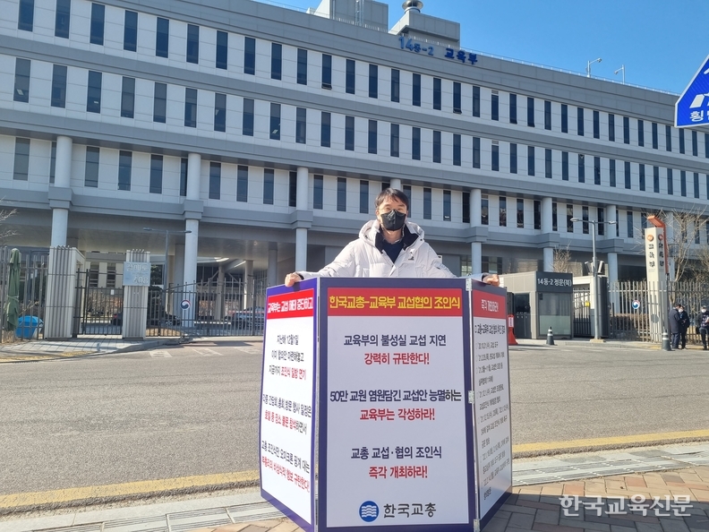 한국교총(회장 하윤수·전 부산교대 총장)은 22일 오전 정부세종청사 교육부 앞에서 교육부의 교섭 해태를 규탄하는 1인 시위를 벌이고, 교육부를 항의 방문했다.