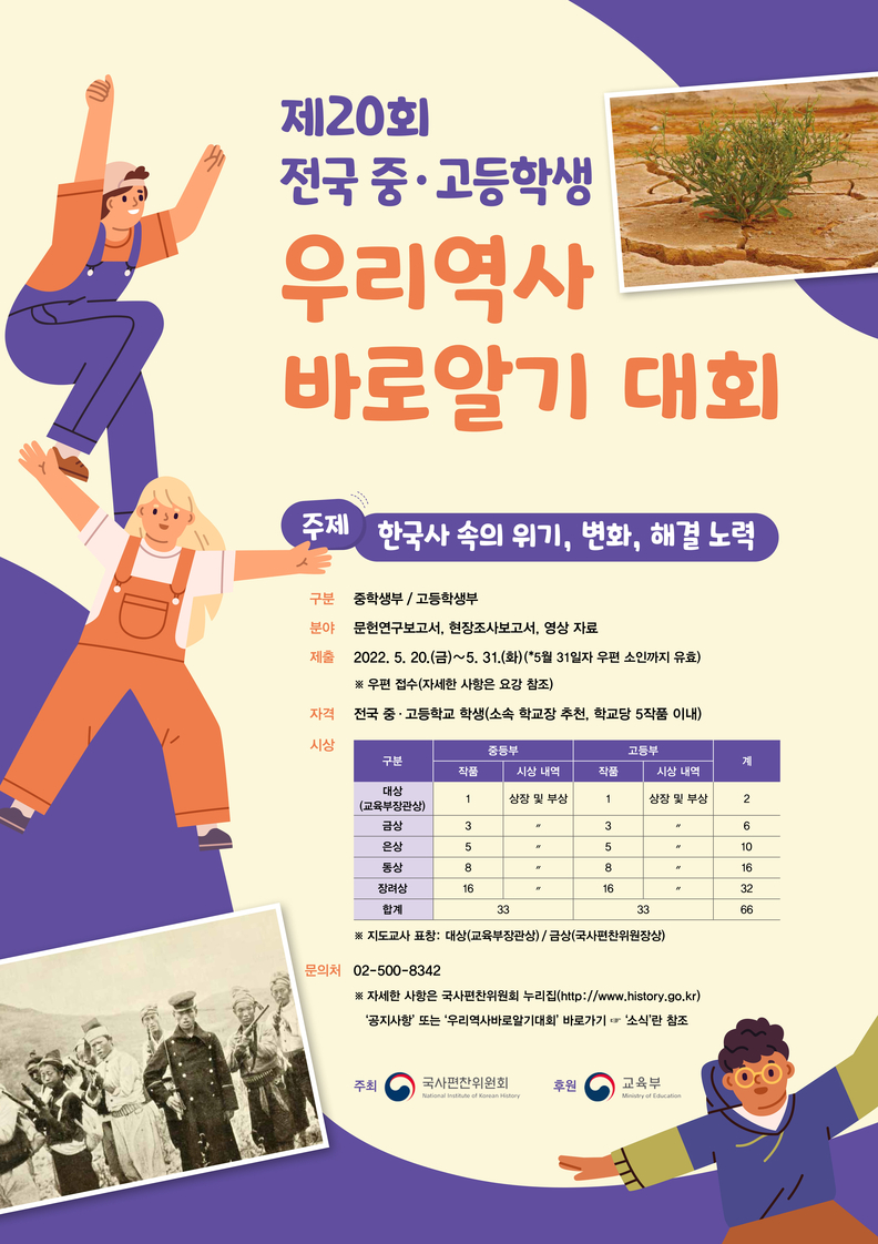 김인걸 국사편찬위원회 위원장은 “이 대회를 통해 중·고등학생들이 역사를 스스로 탐구해보면서 한국사에 대한 깊이 있는 이해와 비판적 인식을 기르고 글로벌한 시민으로서의 역량도 키워가길 바란다”고 밝혔다.
