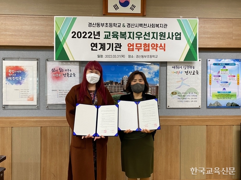 경북 경산동부초등학교(교장 양화숙)는 3월 31일(목) 교육복지우선지원사업의 원활한 협의와 소통을 위해 연계 기관인 경산시백천사회복지관과 업무협약을 체결했다.