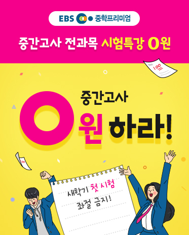 EBS는 1학기 첫 중간고사를 앞둔 중학생을 위한 무료특강 이벤트 ‘중간고사 0원하라!’를 진행한다고 12일 밝혔다.
