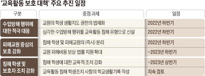 교육부는 이 같은 내용을 담은 ‘교육활동 침해 예방 및 대응 강화 방안’ 시안을 9월 29일 발표했다. △수업 방해 행위에 적극 대응 △피해교원 중심의 보호 강화 △침해학생 및 보호자 대상 조치 강화 △교육활동 보호 지원체계 고도화 △자율적 교육활동 보호를 위한 사회적 협력 확대 등 5대 추진 전략이 주요 골자다.