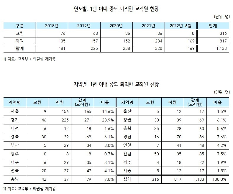 특히 이 중 교원 316명, 직원 817명은 1년 이내 퇴직한 것으로 분석됐다. 1년 이내 중도 퇴직자는 지난해 기준 320명으로 2018년 181명에 비해 2배 가까이 증가했다. 2022년 상반기에도 이미 169명이 퇴직한 상태다. 지역별로는 경기도 교직원이 271명으로 가장 많았다. 1년 이내 중도 퇴직자 1133명 중 23.9%에 해당하는 수치다. 다음으로 서울 교직원들이 165명(14.6%)으로 많았고, 경남(7.6%), 전남(7.5%), 충남(7.0%) 순으로 나타났다.
