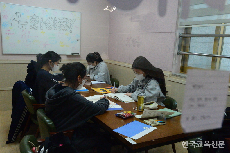 7일 2023년 대학수학능력시험을 앞두고 10일 서울 무학여교(교장 박광훈) 3학년 학생들이 교내 꿈담 학습카페에서 시험 준비에 매진하고 있다.