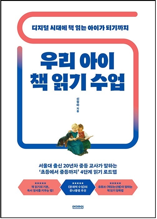 현직 중학교 교사이자 두 아이의 엄마인 저자가 제시하는 디지털 시대, 책 읽는 아이로 키우는 법. 읽기의 골든타임을 초등 저학년, 중학년, 고학년, 중학교 시기로 나누고 시기별 읽기 목표와 실현 방법을 소개한다. 신정아 지음, 언더라인 펴냄.