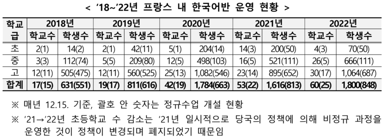 교육부에 따르면 한국어반을 운영하는 프랑스 초·중·고교는 2018년 17곳에서 지난해 60곳으로 3.5배 증가했다. 학생 수도 631명에서 1800명으로 3배 가까이 늘었다. 같은 기간 한국어능력시험(TOPIK) 응시자도 292명에서 780명으로 확대됐다.