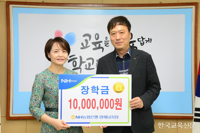 한국교총과 NH농협은행 양재남 지점(지점장 이미선)은 9일 서울 우면동 교총회관에서 장학기금 전달식을 가졌다. 이날 NH농협은행 양재남지점은 한국교총장학회(이사장 정성국)에 장학금 1천만 원을 전달했다. NH농협은행은 2012년을 시작으로 매년 한국교총장학회에 장학금을 기부하고 있다.