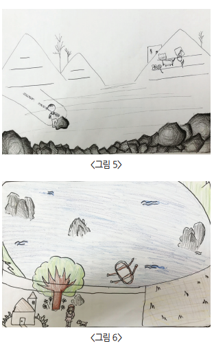 집은 ‘쉼’을 제공해주는 곳, ‘안전’을 느끼게 해주는 곳이다. 풍경화구성법에서 집은 다섯 번째로 그려지기 때문에 공간에 여유가 있다. 그래서 일반적으로 마을의 중심부, 혹은 밭 옆쪽으로 그려진다. 하지만 가정에서 편안함을 느끼지 못하는 아이들은 산꼭대기에 아주 작게 집을 그러거나(<그림 4>), 종이 귀퉁이에 집의 일부만 보이게 그린다(<그림 6>). 가족구성원 역시 ‘자기 혼자’ 사는 경우가 많고, ‘모르는 사람’이 살고 있다고 할 때도 있다. 집과 관련된 다음의 질문들은 아이들이 가족을 포함한 타인과의 대인관계를 어떻게 맺고 있는지 탐색하는 데 도움이 된다.