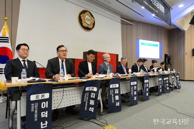 김동석 한국교총 교권본부장(왼쪽 두 번째)이 14일 오후 국회박물관 대강당에서 열린 '교권회복 및 보호 강화를 위한 국회 공청회'에서 발언 하고 있다.