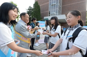 서울 강서구 명덕여중(교장 박범수, 왼쪽 두 번째)은 10일 오전 생명존중 교육주간 및 세계 자살예방의 날과 연계하여 등교하는 학생들을 대상으로 지역사회와 함께하는 생명존중 캠페인 행사를 펼치고 있다.