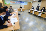 하윤수(부산교대 전 총장, 왼쪽 첫번째) 한국교총 회장이 12일 오후 서울 서초구 한국교총 회관 2층 단재홀에서 제326회 이사회 줌 화상회의를 주재하고 있다.