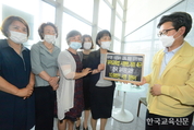 22일 오후 강미애 세종교총 회장(왼쪽 세번째)과 우영혜 한국국공립유치원교원연합회 회장(다섯번째)이 정부세종청사 교육부를 방문해 '유아교육법 시행령 개정 촉구 청원서'를 오석환교육복지정책국장(오른쪽)에게 전달 하고 있다.