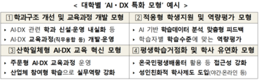 교육부는 4일 전문대학의 인공지능(AI)·디지털 전환(DX) 지원을 위해 올해 24개 내외 사업단에 최대 10억 원씩 지원하는 내용의 ‘2026학년도 AID(AI+Digital) 전환 중점 전문대학 지원사업 기본계획’을 발표했다. 지역 기반 AI·디지털 교육의 거점으로 전문대를 육성해 재학생뿐만 아니라 지역 주민도 AI를 배우고 활용할 수 있도록 하는 것이 이번 사업의 핵심 사항이다. 주요 추진 내용은 ▲AI·디지털 전환(DX) 환경 조성 ▲재학생·교직원·지역주민 맞춤형 AI 역량 강화 ▲대학별 특화모형 구축 등이다. 교육부는 학생이 전공과 관련된 학습에 AI를 활용할 수 있도록 실습실과 인터넷 기반(플랫폼) 등을 확충하고, 학생·교직원에게 생성형 AI를 이용할 수 있는 계정을 보급하게 된다. 학생별 교과·비교과 성과 데이터를 분석해 진로·취업 경로를 설계하거나 중도 탈락 위험을 예측하는 등 전문대학의 AI 기반 학생 지원체계 마련도 돕는다. 교육 수요자별 맞춤형 AI 역량 강화를 통해서는 전공과 관계없이 AI 기초부터 전공 연계 역량까지 관련 교과목을 이수받아 현장 맞춤형 실무역량을 갖출 수 있도록 한다. 교직원에게는 AI 교수법 연수를 지원하는