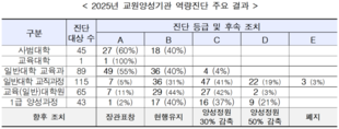 정부가 2027학년도 교원양성정원 3000명 정도를 감축한다. 교육부와 한국교육개발원은 5일 사범대학, 일반대 교육과, 교직과정, 교육대학원 등 총 139개교의 2022~2024년 실적을 대상으로 진행한 ‘2025년 교원양성기관 역량진단’을 발표하고 이와 같은 정원 감축 규모를 공개했다. 전국 45개 사범대 중 A등급은 27개교, B등급은 18개교로 C∼E등급 대학은 없었다. 일반대 교육과는 89곳에서4곳이 C등급을 받았다. 일반대학 교직과에서는 115곳C등급은 47곳, D등급은 22곳이었다. 교육대학원 65곳 중 C등급은 27곳 D등급은 2곳이 나왔다. 이번 진단 결과에 따라 해당 기관의 2027학년도 교원양성정원이 조정된다. C등급과 D등급은 각각 정원의 30%와 50%씩 감축되고, E등급은 폐지될 예정이다. 이에 따른 감축 규모는 일반대학의 교육과 800여 명, 교직과정 900여 명, 교육대학원 1200여 명 등 3000여 명으로 전망된다. 교직과정의 경우 2027학년도 입학생이 진입하는 2028학년도에 적용된다. 교육부는 교원양성기관의 자율 개선을 지원해 미래교육 역량을 갖춘 예비교원을 양성하기 위해 교원양성기관의 교육여건, 교육과정, 성