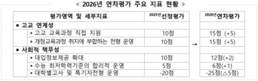 교육부는 24일 ‘2026년 고교교육 기여대학 지원사업 기본계획’을 발표하고 작년에 선정한 전국 92개교에 총 575억 원을 추가로 지원한다고 혔다. 2014년부터 시작된 이 사업은 올해 4주기(2025~2026년)의 2차 연도에 해당된다. 이에 작년에 선정된 곳들의 사업 현황 점검, 성과 확산이 올해 목표다. 올해는 대학들이 고교학점제 시행, 2028 대입개편안 도입 등 대입 환경 변화에 안정적으로 대응할 수 있도록 연차평가를 통해 작년 사업의 성과와 향후 계획을 점검하게 된다. 교육부에 따르면 연차평가의 지표 배점 설정은 2022 개정 교육과정과 2028 대입개편안 취지를 반영해 새로운 입학전형을 구체적으로 설계해야 하는 시기를 고려했다. 대학의 역할 수행과 입학전형 개선이 공교육 안정화, 사교육 부담 완화 등 사업 목적에 부합하는 방향으로 이뤄지도록 한다는 것이다. 교육부는 1차 연도 사업 추진을 통해서는 고교생을 위한 선택과목과 전공·진로 체험활동 개설, 1대1상담(멘토링)과 대입전형 안내·상담 운영 등 학생·학부모에게 총 445개의 프로그램을 제공했다. 사교육 유발 가능성이 높은 논술·특기자 전형보다 학생부·수능 위주 전형 중심 운영도 지원했
