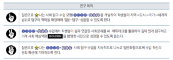 수업 연구의 배경 및 목적 이 글은 2025 수업 혁신 사례 연구대회 시상식에서 중등 1등급 사례 발표를 기반으로 작성하였다. 이 수업은 “나는 사회를 ‘왜’ 가르치는가?”, “나의 수업을 통해 학생들이 어떤 존재(being)가 되기를 바라는가?”라는 근본적인 질문에 답을 찾아가기 위해 시작되었다. 교사의 건조한 설명식 언어로만 가득한 사회 수업에서 벗어나 학생들의 질문과 생각이 톡톡(×) 튀는 살아 있는 세상을 향한 사회 탐구 수업을 꿈꾸었다. 질문으로 나는 사회 탐구 공동체는 이러한 수업 철학이 담긴 슬로건이며, 본 연구 전체를 관통한다. 교실 속 질문은 탐구의 출발점이자 깊이 있는 사고로 학생들을 이끌며, 비로소 학습 공동체 전체를 빛나게 한다. 지속적으로 질문하고 융합적 사회문제에 대해 자신만의 해답을 가진 미래 사회 핵심역량 을 지닌 시민으로 성장시키는 반짝이는 사회 수업을 구상하고 싶었다. 수업 연구 모형을 설계하며 연구자의 고민은 한 학기 동안의 수업을 거치면서 탐구의 맥락-깊이-리듬이 4번의 사이클로 반복·확장되게 구조화할 수 있을까였다. 이것이 가능하려면 제도적 기반이 필요하여 중3 사회과를 교육청의 학생평가 선도과목으로 신청하여 수행평가 100%로 운영하였다. 본 연구에서의 ‘’은 학생들의 호기심과 사고가 교실을 밝히는 순간을 상징한다. 또한 협력적 탐구를 더 깊고 풍성하게 해주는 에너지원과 수업전략을 지칭한다. [PART VIEW] 는 탐구의 맥락이자 공동체의 사회문제를 삶과 연결하여 진행한 수행평가 과제 4개에 해당한다. 학생들이 작은 마을에서 지역-도시-국가-전 세계적 맥락으로 범위를 넓혀가며 탐구를 확장해 나가는 성장의 여정을 의미한다. 은 학생들이 배움의 과정에서 리듬을 타고 반복하는 탐구의 단계를 나타내며, 학생들은 각 수행과제에서 각자 자신의 소주제를 선정하고 자신이 선정한 소주제를 깊이 있게 탐구할 탐구질문을 만든다. 촛불 질문 → 등불 질문 → 별빛 질문은 학생들이 탐구질문을 해결해 나가는 데 있어 이정표가 되는 안내 질문에 해당한다. 질문하고 탐구하는 능력은 한 번(One-shot)의 수업으로 이루어지지 않는다. 본 연구의 ‘사회 탐구 공동체’는 질문이 안전한 분위기 속에서 질문-탐구-성찰의 순환(루틴) 구조를 지닌 희망의 사회교실(장(場))을 가리킨다. 은 2022 개정 교육과정의 핵심역량 중 사회과 교과역량과 연결되는 미래 사회 핵심역량을 가리킨다. 시민은 미래 사회 핵심역량을 지닌 시민이다. [PART VIEW] 위와 같은 모형을 기반으로 어둠과도 같은 다양한 공간적 범위의 사회문제를 해결해 나가는 과정을 빛을 찾아가는 4개의 프로젝트로 구안하였다. →→→ 사회 탐구 과제로 학생들이 지역→도시→국가→세계적 맥락으로 탐구가 확장된다. 각 사회 탐구 과제에서는 (관계 맺고 질문하기)→(깊이 있게 탐구하기)→(표현하고 성찰하기)의 3단계의 탐구의 리듬이 나선형으로 반복·심화 된다. 수업을 마무리하며 질문으로 ‘빛’나는 × 사회 탐구 공동체 프로그램으로 미래 사회 핵심역량의 5가지, 즉 창의적 사고력, 비판적 사고력, 문제해결력 및 의사결정력, 의사소통 및 협업 능력, 정보 활용 능력이 크게 상승했음을 알 수 있었다. 특히 창의적 사고력이 사전 대비 프로그램 적용 후 31.3%~35.5% 상승했다는 것을 알 수 있는데, 학생들이 스스로 새로운 질문 및 아이디어를 만들어내고 이를 실제 탐구 과정에 적극 활용하는 역량이 크게 강화되었음을 확인할 수 있다. 나머지 모든 역량의 하위 요소들이 사전 대비 20% 이상 상승했기에 질문으로 나는 × 사회 탐구 공동체 프로그램이 학생들의 미래 사회 핵심역량 함양에 크게 기여했음을 알 수 있었다. 학생들에게 사회 탐구 프로그램 중 어떤 프로젝트가 각 역량 함양에 가장 큰 도움을 주었는지 묻는 설문을 추가로 실시하였다. 설문에 ‘팜유 농장의 외침에 빛으로 응답하라’의 경우 비판적 사고력, 문제해결력 및 의사결정력을 가장 많이 함양시켜준 평가로 판단되었다. ‘전 지구적 문제, 해답의 빛을 밝혀라’의 경우 창의적 사고력과 의사소통 및 협업 능력을 가장 신장시켜 주었던 평가로 인식되었다. 정보 활용 능력의 경우 의 모든 프로그램에서 골고루 신장되었음을 시사한다. 양적 분석의 결과를 보완하기 위해 3학년 90명의 학생 소감문 및 디지털 포트폴리오(자기성찰평가) 내용을 분석하여, 반복적으로 등장한 용어들을 범주화하여 의미를 도출하였다. 학생들은 질문으로 빛나는 × 사회 탐구 공동체에 참여하면서 ‘질문’, ‘조사’, ‘토의’, ‘토론’, ‘성장’, ‘생각’, ‘사고’, ‘변화’, ‘역량’과 같은 내용을 언급한 학생들이 많았고, 실제 사회과에서 미래 사회 핵심역량에 해당하는 비판적 사고력, 창의적 사고력, 의사소통 및 협업능력, 정보 활용 능력, 문제해결력 및 의사결정력이 신장되었다고 이야기한 학생들이 많았다. 본 연구를 통해 학생이 스스로 사회문제를 ‘나의 질문과 목소리’로 연결하며 시민으로 성장해 가는 모습을 확인할 수 있었던 순간, 나의 사회수업이 누군가의 삶에 진정한 울림을 주었음을 느꼈다. 연구자의 본 수업