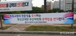 [한국교육신문 한병규 기자] 오세복 제7대 부산교대 총장 이임식은 19일 코로나19 확산 방지를 위해 실내에서 비대면 영상 녹화본으로 진행됐다. 교수직로 돌아온 오 전 총장은 2026년 2월까지 부산교대 교수로 재직하게 된다. 이날본관 외부에서는 졸업생들이 집회를 열고 오 총장을 규탄했다.부산교대 총동창회가 부산대와의 통합을 주도했다는 이유로 오 총장의 교수직 복귀를 반대한 것이다.총동창회는 “오 총장은 학교 구성원들의 의견 수렴 없이 부산대와 통폐합을 추진해왔다”며 “학교를 망친 오 총장은 가르칠 자격이 없다. 교수직으로 복귀하는 대신에 학교를 떠나야한다”고 밝혔다. 박수자 부산교대 신임 총장은 곧바로 바톤을 받아 20일 취임식을 열고 공식 업무에 들어갔다. 이날 취임식 역시 참석인원을 최소화하고 유튜브 중계로 진행됐다. 서울대 국어교육과 박사 출신인 박 신임 총장은 1995년 부산교대 교수로 부임해 교무처장을 역임했다. 지난 6월 4명의 후보가 출마했던 제8대 총장 선거 당시 2위를 했음에도, 과반 득표자가 나오지 않아 치러진 결선투표에서 근소한 차이로1순위 임용대상자가 됐다. 그는 ‘부산대와의 통합 찬성파’로 알려지면서 동문들의 취임 반대가 잇따랐으나, 결국 교육부의 추인으로 제8대 총장에 취임할 수 있었다. 오 전 총장 취임 당시 ‘장애인 비하 발언’ 반발로 추인이 7개월간 미뤄졌던 것과 비교하면 매우 신속한 결과라는 반응이 나오고 있다. 동문들은 박 신임 총장의 움직임을 지켜보면서 대응한다는 계획이다. 19일 국회 교육위원회 국정감사에서 피감기관장 자격으로 출석한 차정인 부산대 총장이 부산교대와의 통합 의지를 강하게 표출하면서 동문들의 심기는 더욱 불편해진 상황이다. 양 대학 간 통합이 가시권에 들어간 것 아니냐는 반응이 나오고 있다. 차 총장은 부산교대와의 통합 문제에 대한 의원들의 질문에 “부산교대와의 통합이 이뤄진다면 사범대를 현재 부산교대가 있는 거제동캠퍼스로 일부 이전해 사범대와 교대의 결합이 이뤄질 수 있게 하겠다”면서 “초등교사도 중등교사 이상으로 시야가 넓어야한다. 초등교사도 종합대에서 양성하는 것이 바람직하다고 본다”고 답했다. 부산교대와 부산대는 지난 2017년부터 통합 논의를 시작해 올 4월 부산교대와 ‘종합교원양성체제 구축을 위한 양해각서(MOU)’를 체결한 바 있다. 하지만 부산교대 재학생과 졸업생들의 강한 반발에 주춤한 상황이다. 한국교총, 부산교총, 전국교직원노동조합, 초등교사노동조합, 전국교육대학생연합 등도 부산교대 동문들의 반대 의견에 동참하고 있다. 이 과정에서 전국교대총동창회가 조직되기도 했다. 이들은 “초등교원의 전문성을 무시하는 양 대학의 통폐합을 반대한다”는 입장을 고수하고 있다.